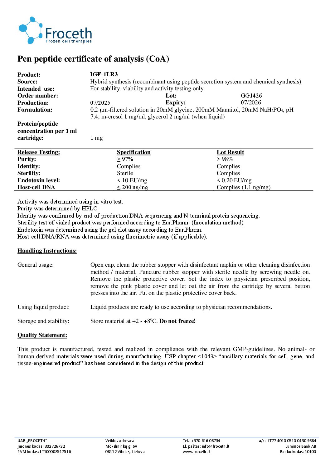 Examples of calculated units per pen of IGF 1 LR3 1mg corresponding to micrograms: