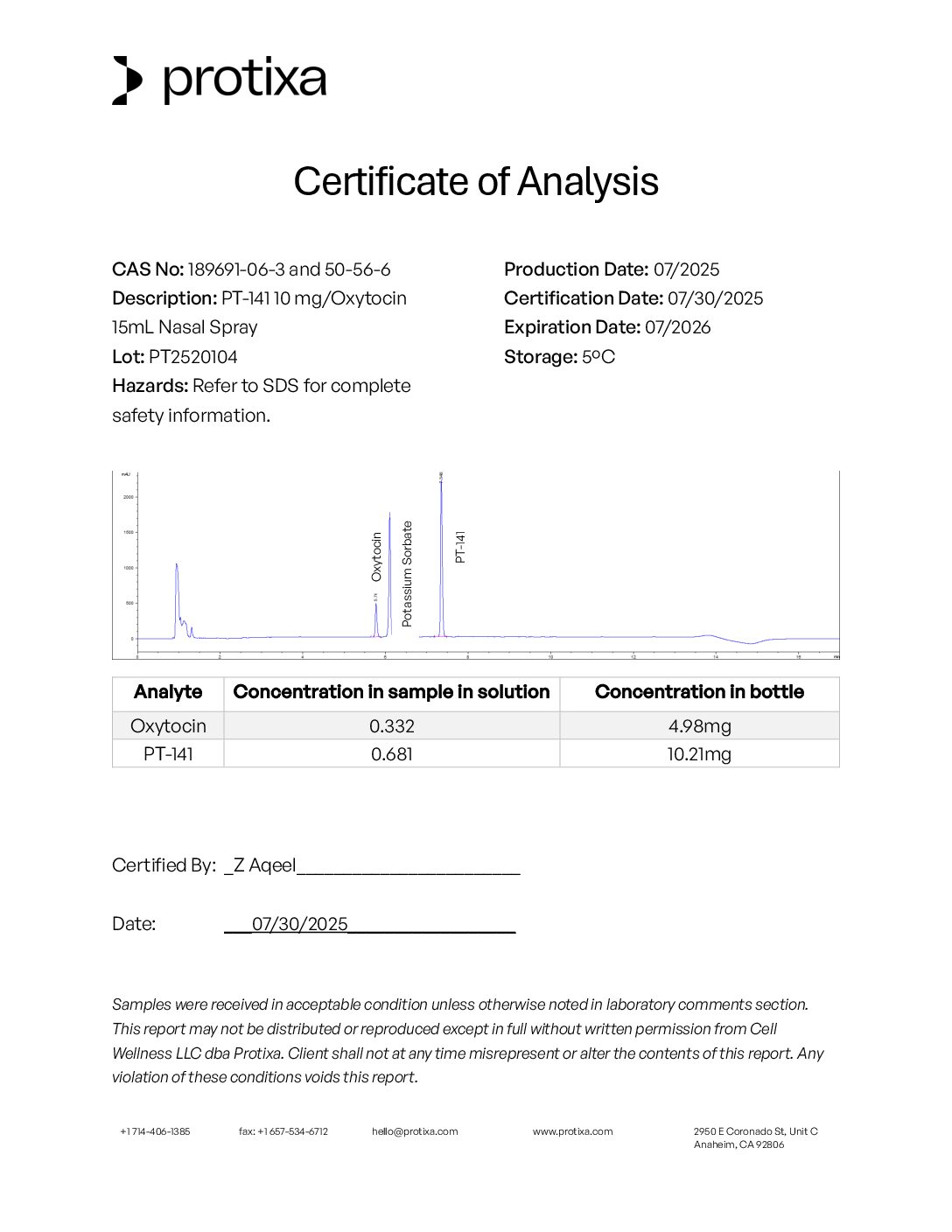 Ingredients: PT-141 10mg / Oxytocin 5mg Nasal Spray, Water, Proprietary Ionic Delivery Base (Water, L-Lysine, Citric Acid), Potassium Sorbate, Citric acid.