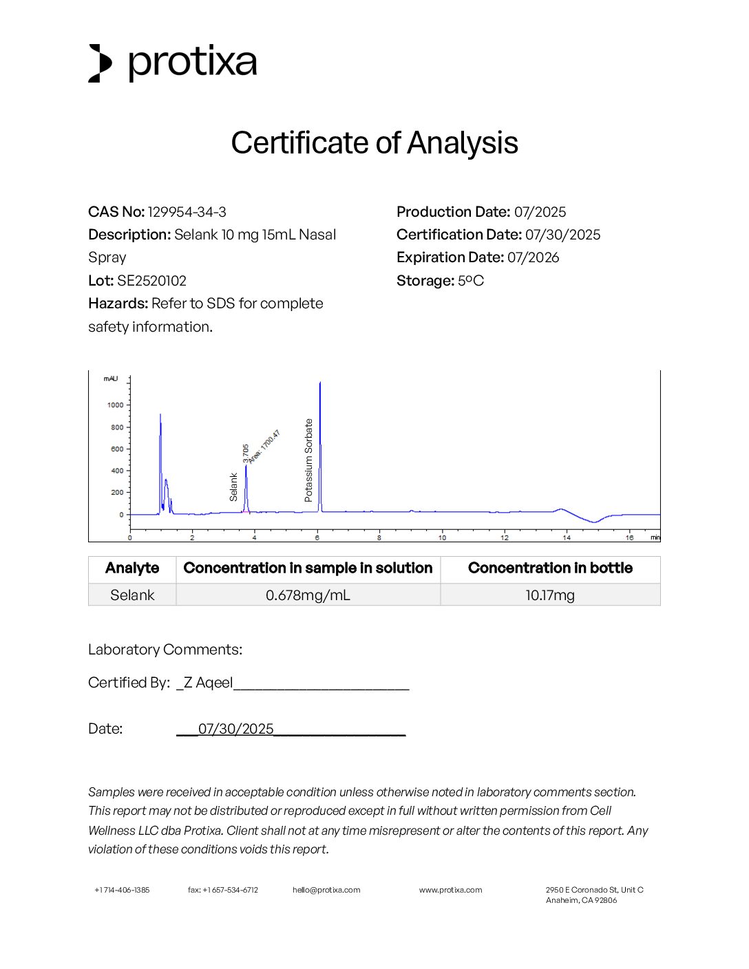 Ingredients: Selank 10mg Nasal Spray, Water, Proprietary Ionic Delivery Base (Water, L-Lysine, Citric Acid), Potassium Sorbate, Citric acid.