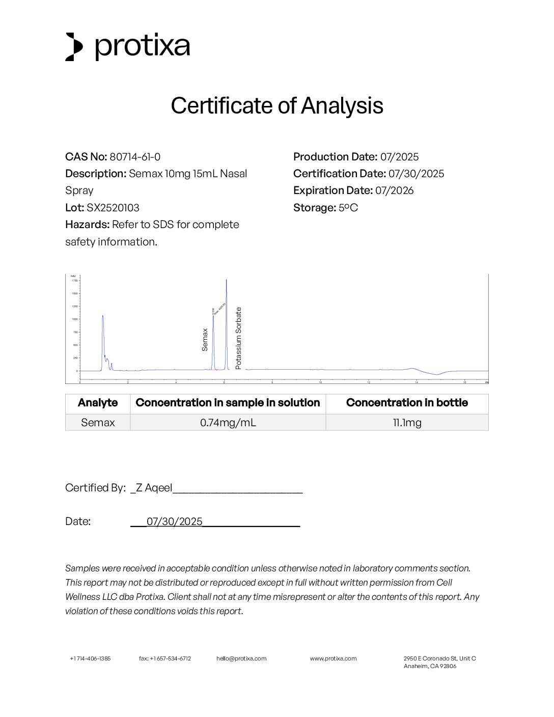 Ingredients: Semax 10mg Nasal Spray, Water, Proprietary Ionic Delivery Base (Water, L-Lysine, Citric Acid), Potassium Sorbate, Citric acid.
